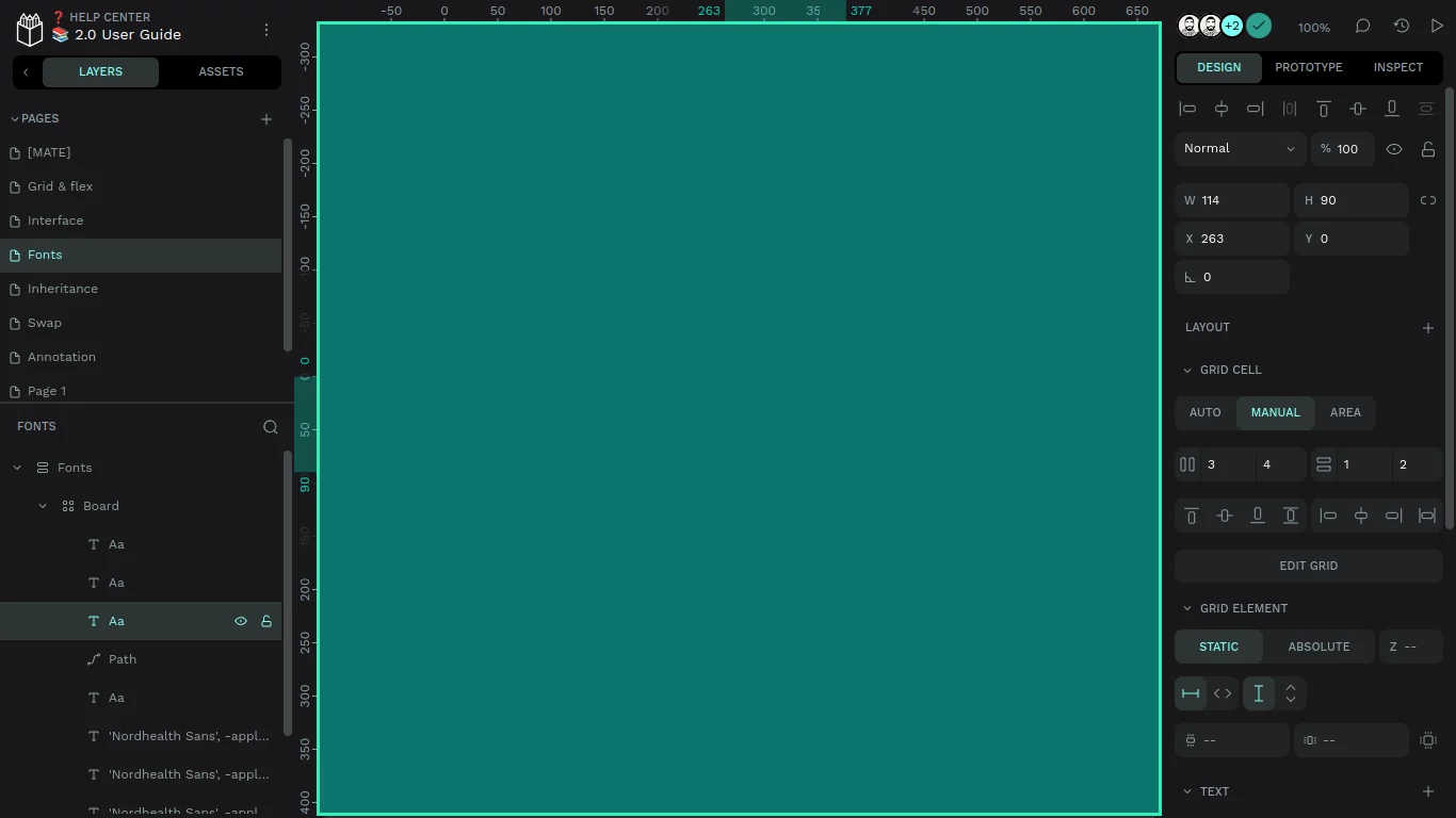 The Workspace is where you create designs. You have an infinite canvas where you can directly work but you also have the ability to create pages and boards that will help you to create exportable components.